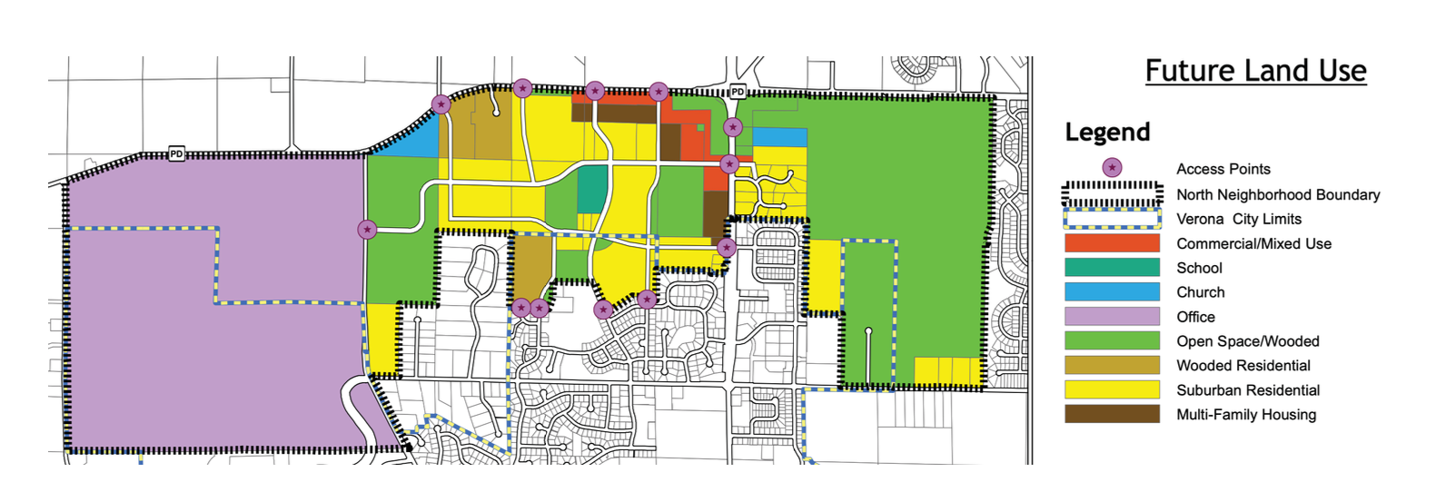 Multi-Family zones are further out towards PD (brown).